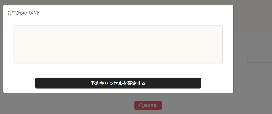「予約をキャンセルする」をクリックすると予約キャンセルの画面が開きます。必要に応じて「お店からのコメント」を入力のうえ「予約キャンセルを確定する」をクリックすることで予約をキャンセルできます。