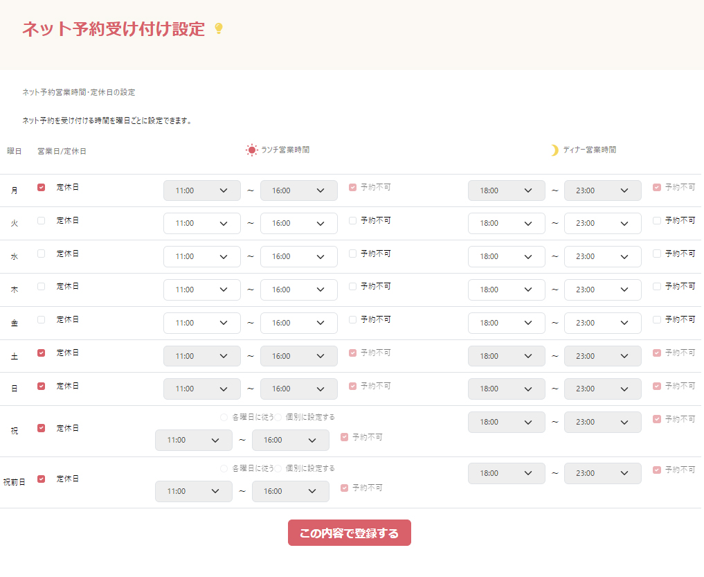曜日や祝日・祝前日の単位でネット予約受付の設定をすることができます。