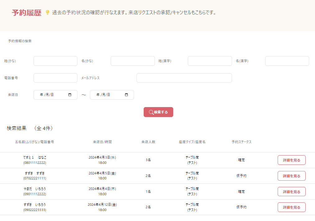 検索条件を指定して条件に一致した予約だけを絞り込み表示できます。