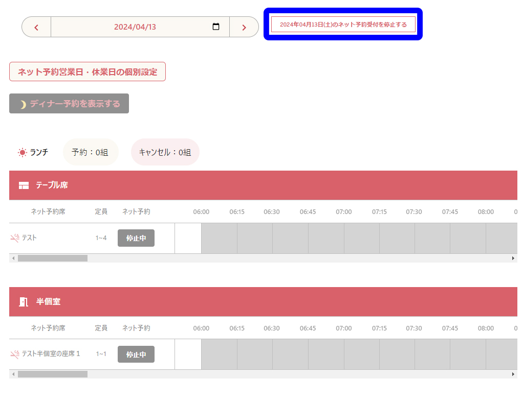 「yyyy年mm月dd日(w)のネット予約受け付けを停止する」ボタンをクリックすると、選択した日のネット受付予約をすべての座席に対して一括で停止することができます。