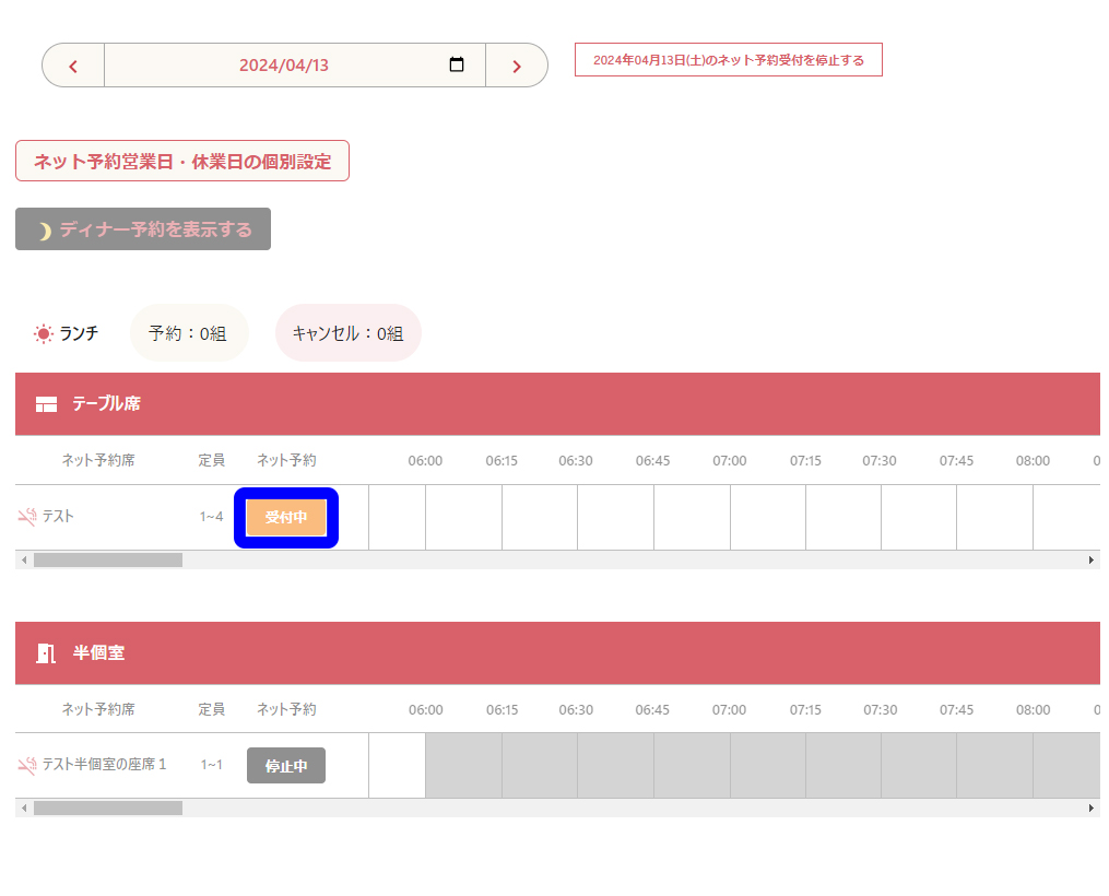 停止したネット受付予約を「停止中」から「受付中」の状態にするには、任意の席の「停止中」ボタンをクリックします。クリックした席のネット予約が「受付中」に変わります。